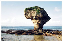 原本是一大型的珊瑚礁岩磈,但經年的受到海浪雕著、風雨吹拂、潮夕侵蝕…竟鬼斧神工似的精雕而成上寬下削的外形。